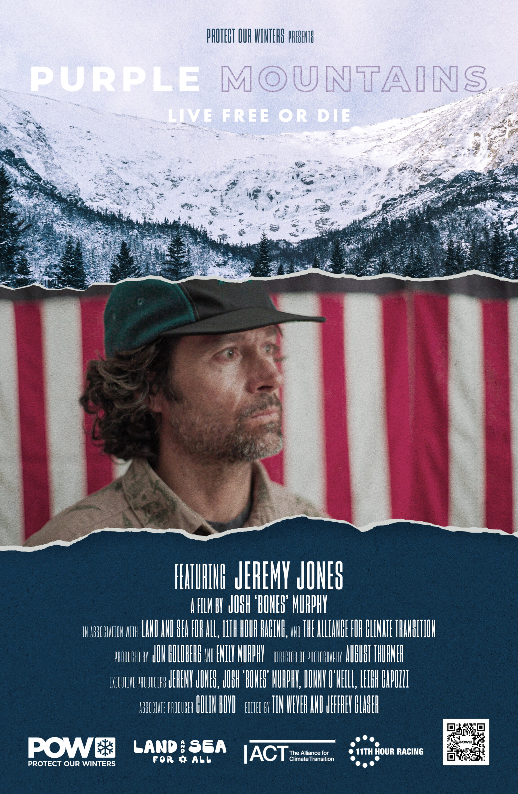 Film Synopsis for Purple Mountains, Live Free or Die: Professional snowboarder and POW founder Jeremy Jones has always had a deep connection to the outdoors. Itʼs not just his escape—itʼs his identity, his passion and his legacy. Growing up in New England, Jeremy carved out his beginnings in the mountains, but in the years since, heʼs witnessed troubling changes: wilder weather, fewer snow days and mountain towns struggling to survive. In this sequel to Purple Mountains, Jeremy returns to his roots in New Hampshire, revisiting the mountains that shaped him. Motivated to protect the places he loves, Jeremy embarks on a journey to bridge the political divide over climate change. He finds common ground with outdoor enthusiasts from all walks of life, understanding their hopes and fears while tackling the issue head-on—from the Mount Washington Valley to the unfrozen waters of Lake Winnipesaukee. With stunning visuals and raw emotion, Purple Mountains Live Free Or Die offers a timely perspective: we may stand on different sides of the climate debate, but our shared love for the outdoors can bring us together.